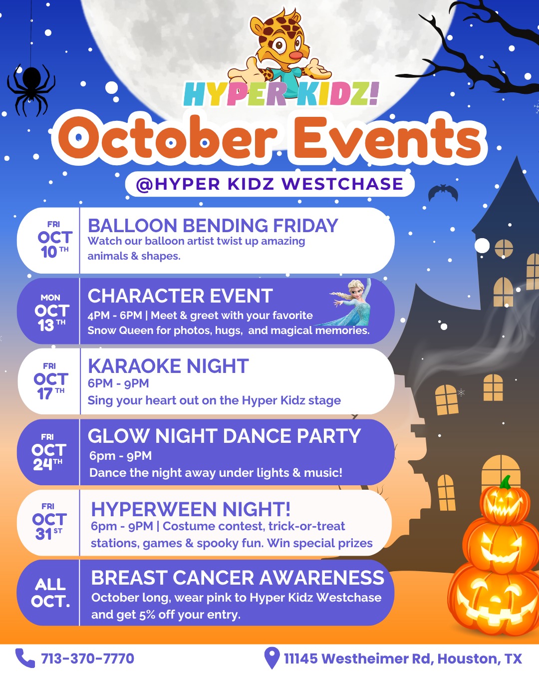 Play is the work of the child and is beneficial to their mind and body. Hyper Kidz offers a unique Indoor Playground Westchase location for children to explore, featuring a fun theme, plenty of exciting attractions, and safe play zones designed for different developmental age groups. Our 18,000 sq ft indoor playground is the perfect place to bring your child for open play or to host their next birthday party! We offer unlimited play 7 days a week for children ages 0-13. Come play with us at the premier Indoor Playground Westchase with your families and lots of love!